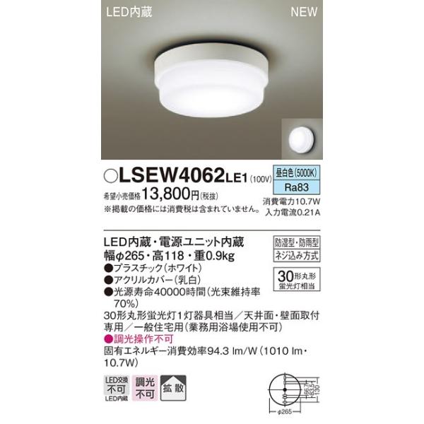 (納期1ケ月〜) パナソニック LSEW4062 LE1 LEDポーチライト 浴室灯 壁面・天井面取付型 防湿防雨 昼白色 1010lm 拡散型 非調光『LSEW4062LE1』