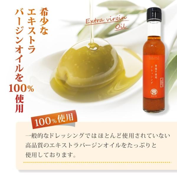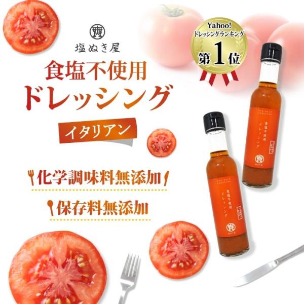 化学調味料、添加物不使用でたっぷりトマトとエクストラオリーブおいるで作った日本初の食塩不使用の無塩ドレッシングです。ビタミン、ミネラル、ポリフェノールたっぷりな健康ドレッシングです。