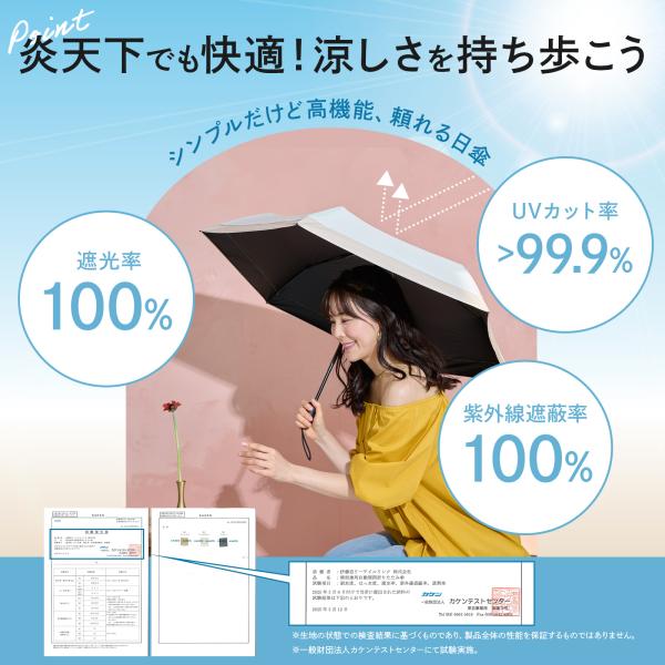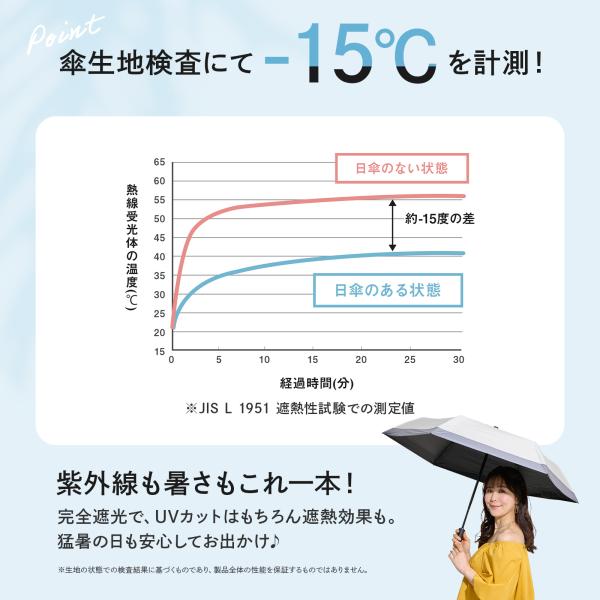 耐熱性検査では日傘がない場合と比較し、日傘をさした際-15度の温度差があり暑い夏の日でも涼しく快適にすごす事ができます。