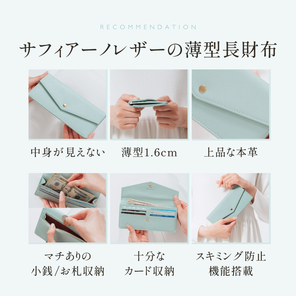 傷・水に強いサフィアーノレザーを使用した長財布。