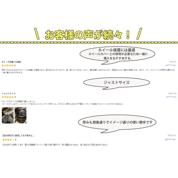 他の50cm55cmと比較して、60CMタイヤ フェルトパッドは、タイヤをより包括的に保護し、軽自動車だけでなく、より大きなタイヤにも適用しています。また、フェルトパッドの厚みも3mmに増厚、丈夫なフエルトパッドがホイール表面に傷がつくのを防止します。