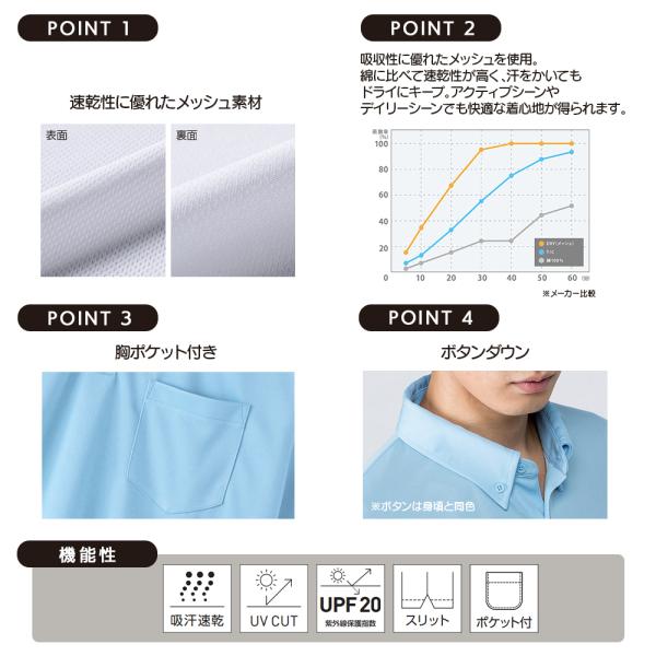 ・抜群の吸汗速乾性:通気性の良いメッシュ生地を採用。洗濯後もすぐに乾くため、毎日の洗い替えが必要な職場や制服に重宝します。