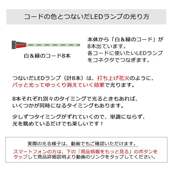 つないだ8本のLEDランプがそれぞれ、打ち上げ花火のように、パッと光ってゆっくり消えていく効果で光ります。