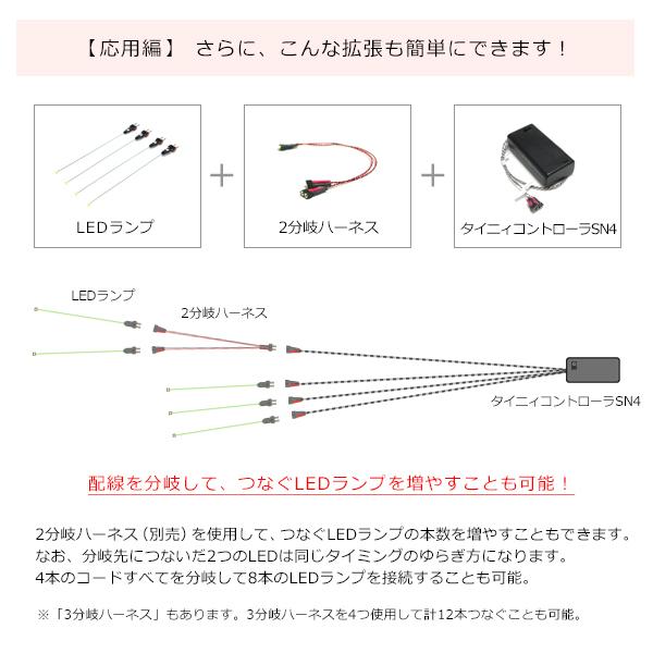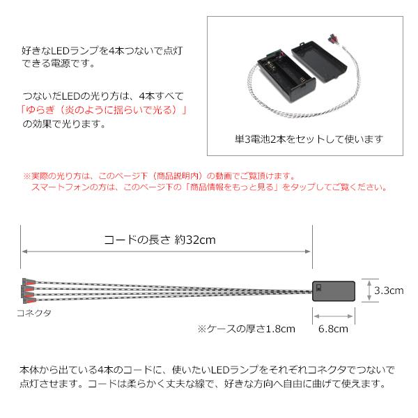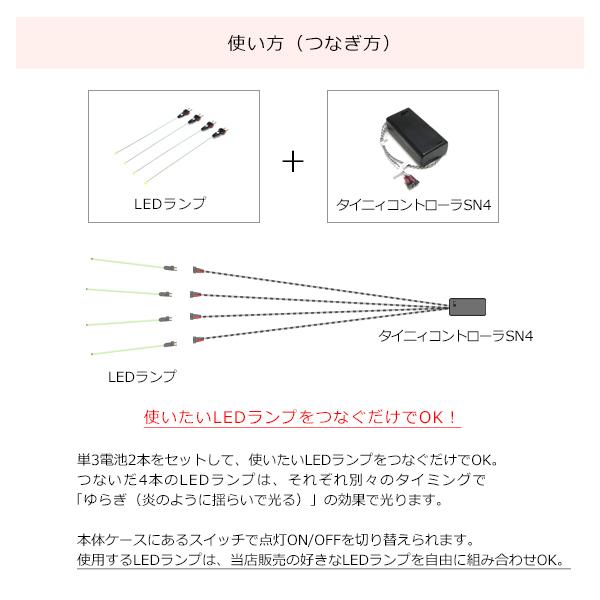 このタイニィコントローラSN4と合わせて、お好きなLEDランプを4本ご購入いただき、「炎」のようにリアルに揺らいで光るLED演出を、ぜひお楽しみください!