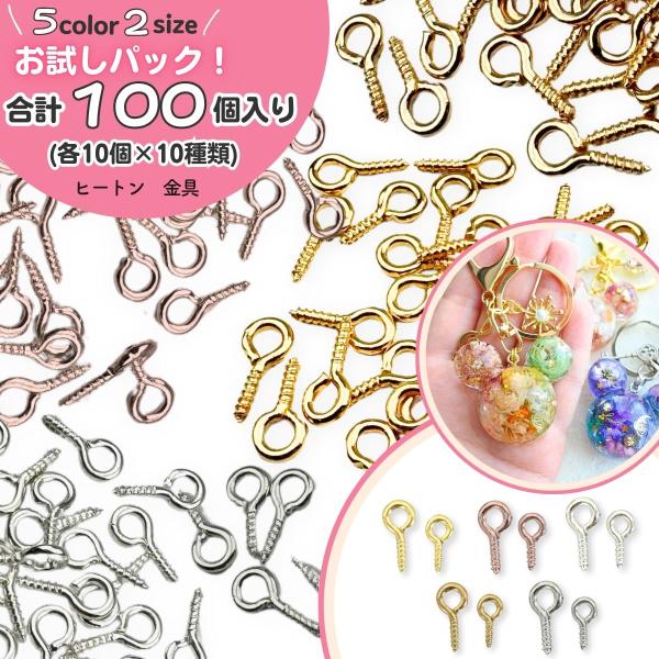 【基礎金具】お試し用 ヒートン 金具 全種 100個セット ゴールド シルバー ピンクゴールド ホワイトシルバー 基礎パーツ アクセサリー パーツ レジン