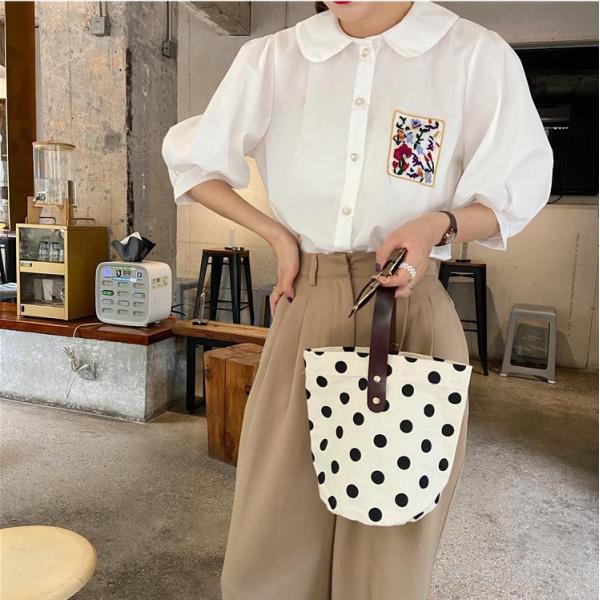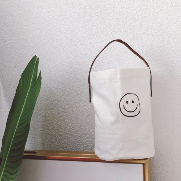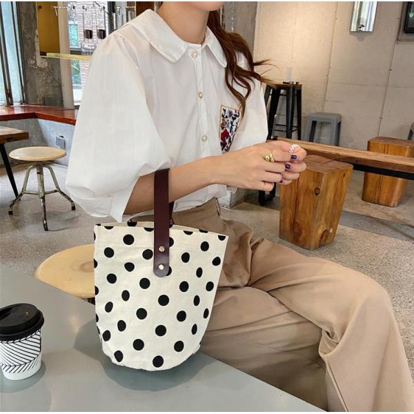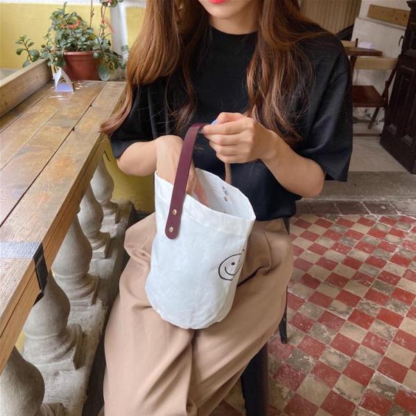 小さめカジュアルファッション帆布バッグスマイルドット柄軽く可愛い手持ち エコ バッグコンビニバッグレジバッグ台形 シンプル大容量バッグバケツ型