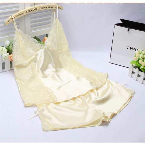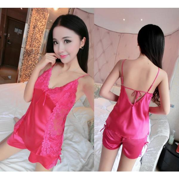 シルキーサテン&幅広レースのキャミソールとタップパンツのセット無地部屋着ルームウェア