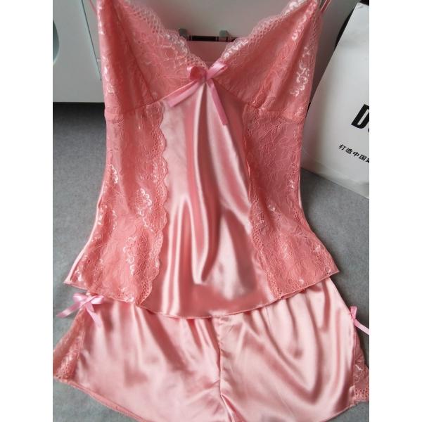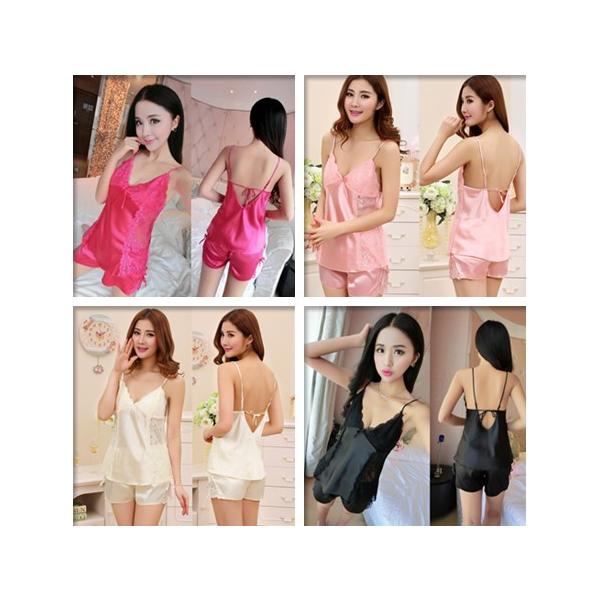 滑らかで肌当たりのよいシルクタッチサテンのシャルムーズキャミソールとタップーパンツのセット。