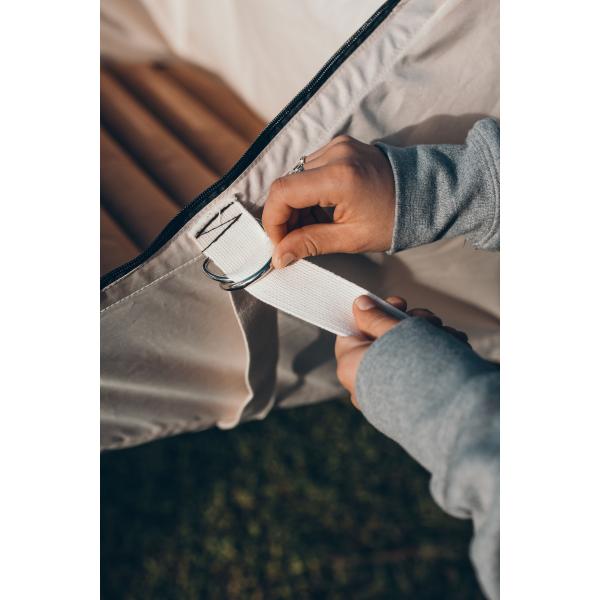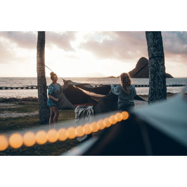 蚊帳付きハンモック、レインフライ、エアマット、バンティングバナー、ウェルカムマット、スプレッダーバー、ツリーストラップ、ペグ、ガイロープ、収納ポーチ