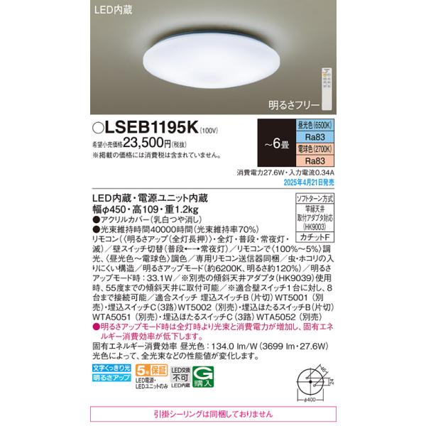 LSEB1195K パナソニック LEDシーリングライト LSシリーズ 調光・調色 〜6畳【LGC21104同等品】