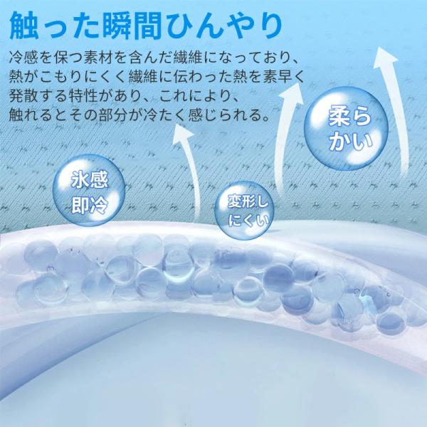 冷感繊維を使用し、熱がこもりにくい設計。繊維が熱を素早く発散するため、触れるとひんやり。水や汗に濡れると気化熱でさらに冷却効果が発生し、肌温度を3〜5度下げます。真夏の暑さ対策にも最適です。