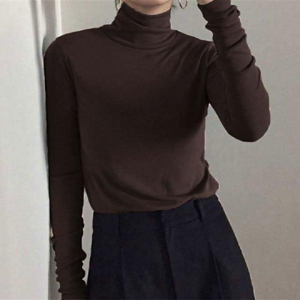 トップス Tシャツ レディース 長袖 リブ シンプル 無地 ベーシック ハイネック 春秋