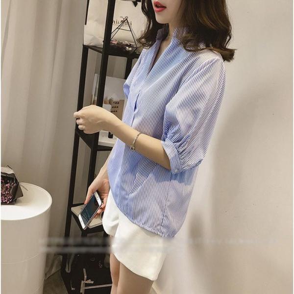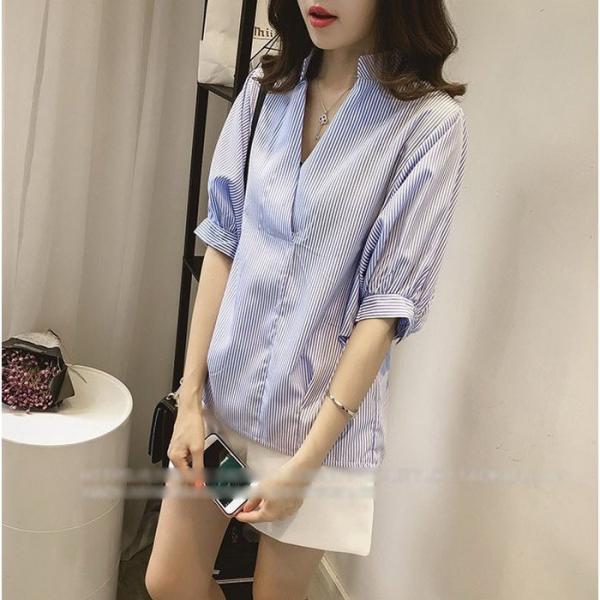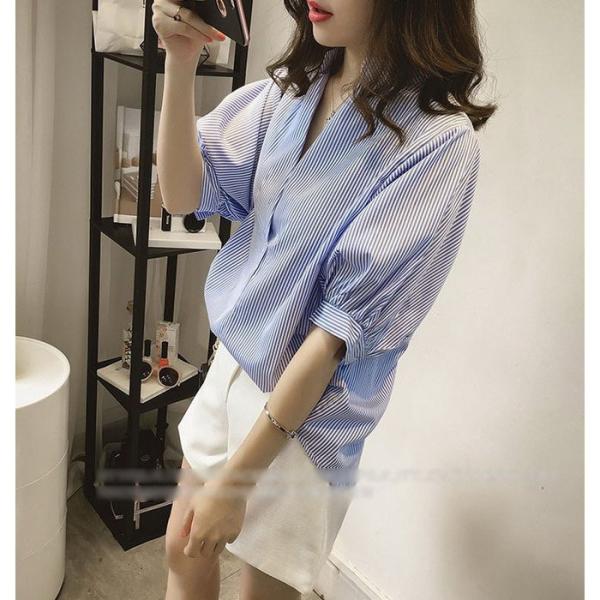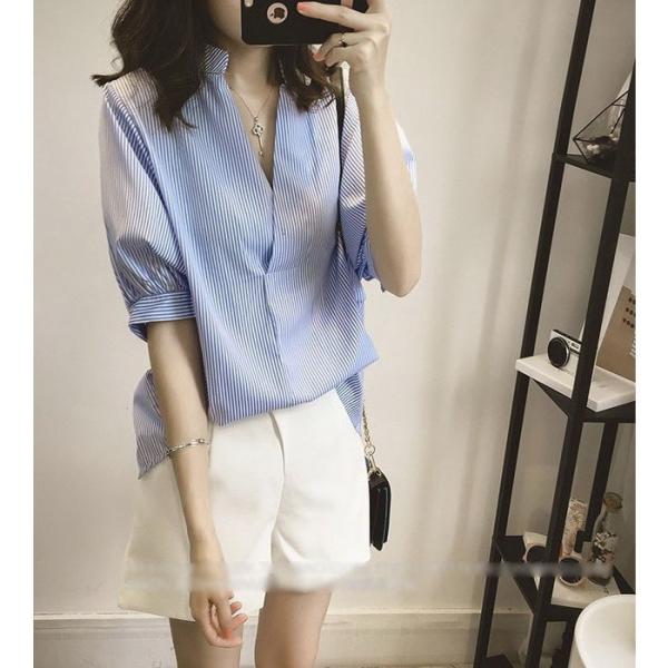 レディースブラウス春夏40代半袖トップスオシャレブラウスおしゃれパフスリーブブラウスVネック韓国風上品通勤OL大人