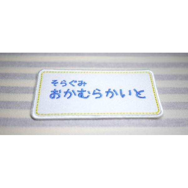 上の行にクラス名など(ひらがなと数字が可能です)、中央寄りに8文字までのお名前(ひらがなのみ)を刺しゅうします。