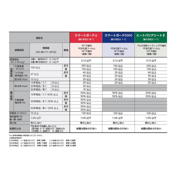遮熱機能を持ち、かつ従来の透湿防水シートの施工性・高い透湿性と防水性を保持した商品です。遮熱性に反射率の高いアルミ箔ではなくアルミ特殊コーティング不織布を使用しているのも透湿性を確保する為です。透湿性能は内部結露を防止する上で非常に重要であり、高い透湿性がヒートバリアシートIIの特徴です。