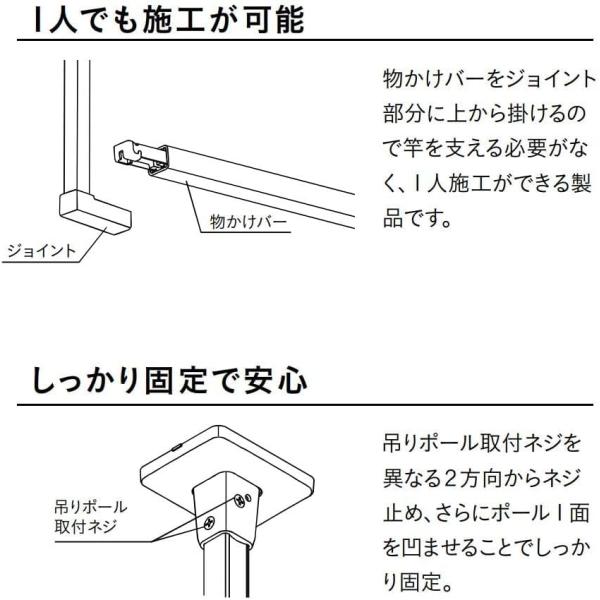 【材質(表面仕上)】ベース:亜鉛ダイカスト(塗装仕上)/ベースカバー:AES樹脂/吊りポール:アルミ押出形材(アルマイト+塗装)、亜鉛ダイカスト/ジョイント:亜鉛ダイカスト(塗装仕上)/ジョイントカバー:AES樹脂/物かけバー:アルミ押出形材(アルマイト+塗装)、鉄