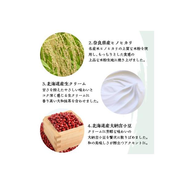 <原材料>卵(国産)、乳等を主要原料とする食品(植物油脂、脱脂粉乳)、蜜付け豆(大納言小豆、砂糖)、クリーム、砂糖、米粉、抹茶、トレハロース、安定剤(増粘多糖類)、乳化剤、メタリン酸Na、ソルビトール、香料(一部に卵・乳成分・ゼラチン・大豆を含む)