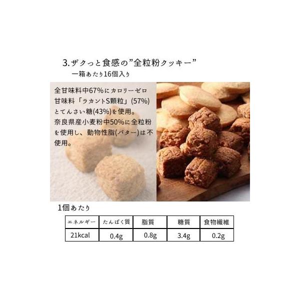 奈良県産小麦粉、全粒粉、牛乳、太白胡麻油、エリスリトール、甜菜糖、オーガニックベーキングパウダー、塩、ラカンカエキス、甘味料(ラカンカ抽出物)