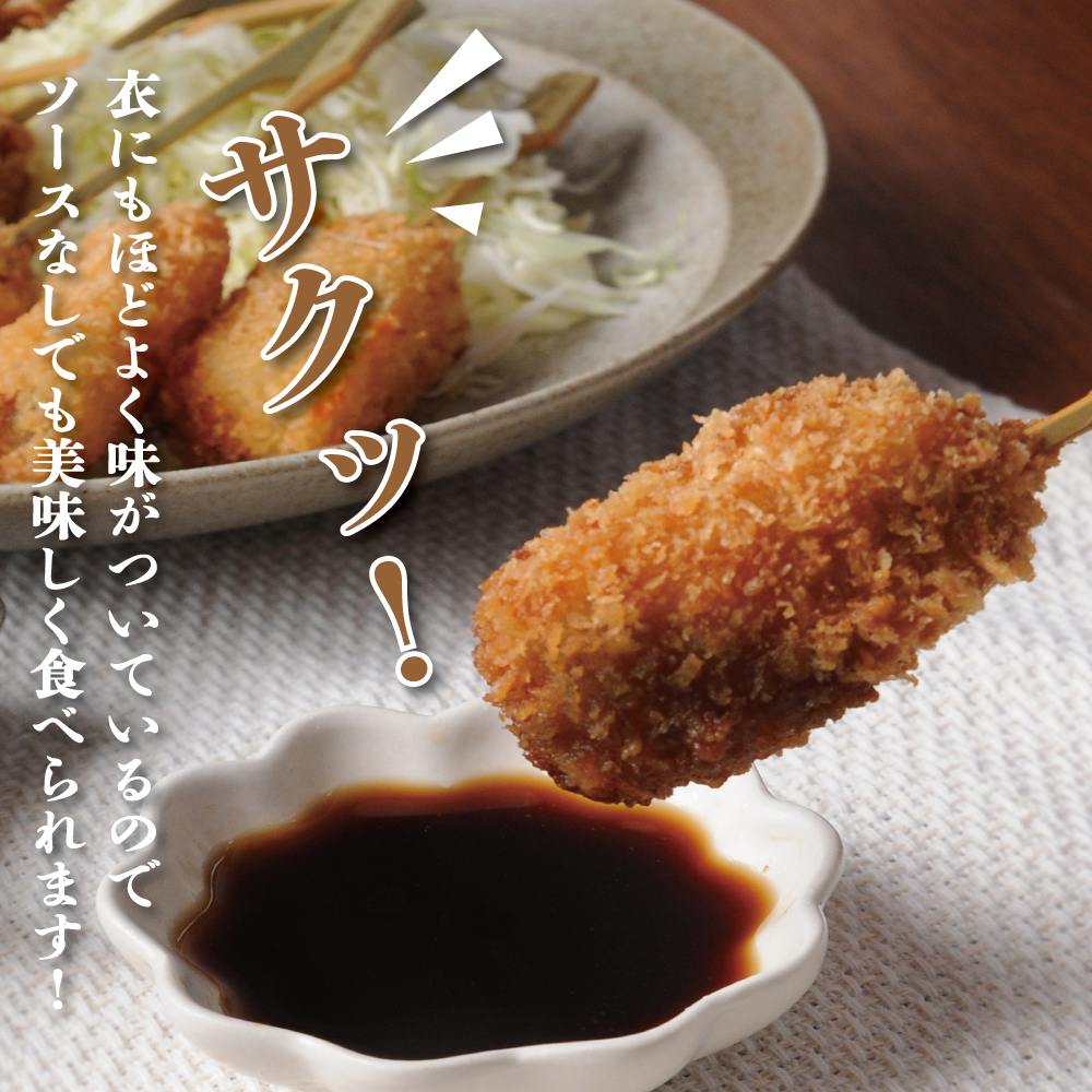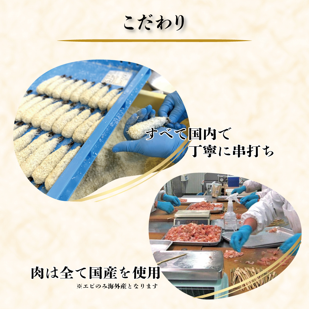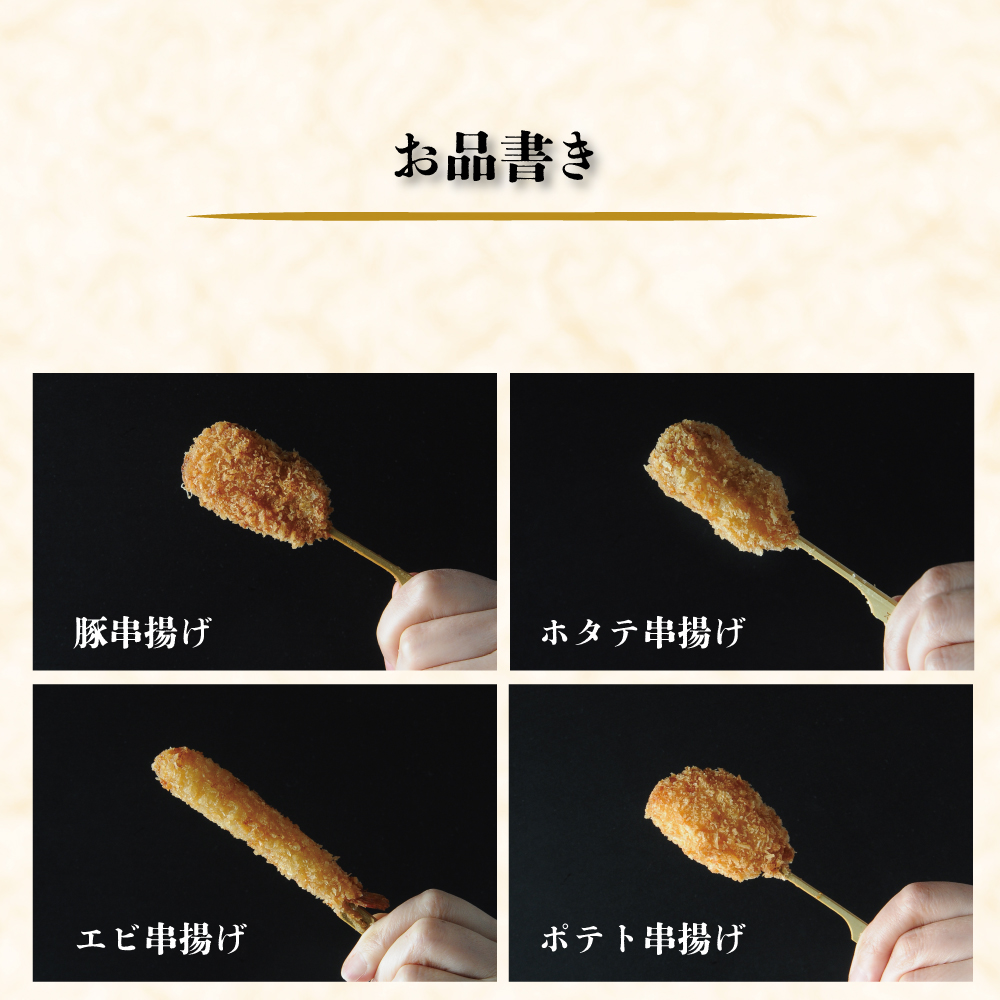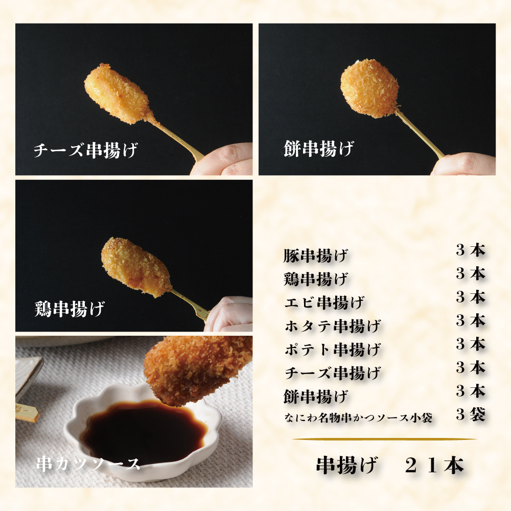 ■内容量:串揚げ21本セット:ポテト串揚げ(25g×3本)、鶏串揚げ(25g×3本)、豚串揚げ(20g×3本)、ホタテ串揚げ(20g×3本)、チーズ串揚げ(20g×3)、エビ串揚げ(18g×3)