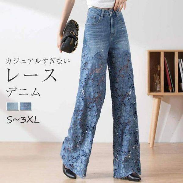 デニムパンツ レディース 夏 レース 切り替え ロング丈 薄手デニム 透かし彫り レース ワイドパンツ 華奢見え 体型カバー おしゃれ ゆったり カジュアル ナチュ