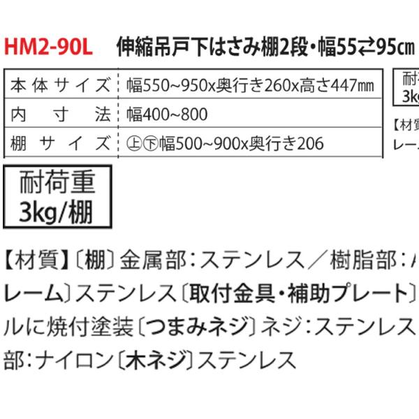 キッチン収納 伸縮吊戸はさみ棚 2段 幅55〜95 HM2-90L