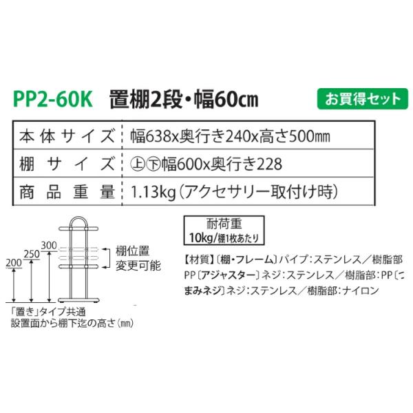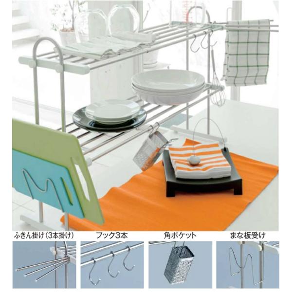 お買い得セット 置き棚2段 幅60cm PP2-60K アクセサリ− ふきん掛け フック3本 角ポケット まな板受け付き