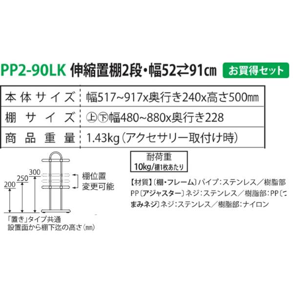 お買い得セット伸縮置き棚2段 幅52〜91cm PP2-90LK アクセサリ− ふきん掛け フック3本 角ポケット まな板受け付き