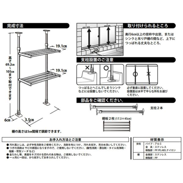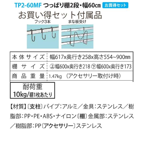 つっぱり棚2段 TP2-60MF 幅60cm お買い得セット アクセサリ− フック3本 まな板受け付