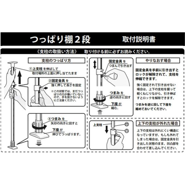 つっぱり棚2段 幅60cm ワンタッチのつっぱり支柱。取付けはとても簡単です。