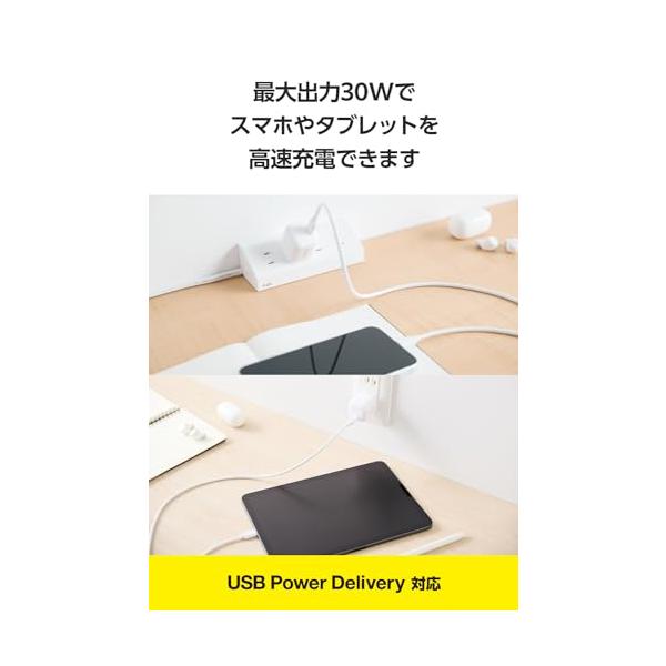 ・USB Power Deliveryに対応したUSB Type-C(TM)ポートを搭載し、対応するスマートフォン、タブレット、ノートパソコンなどを充電できるUSB AC充電器です。