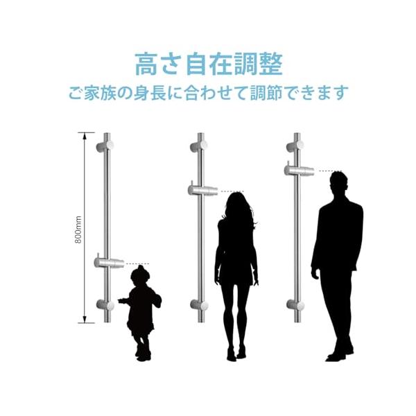 ・[高さ調整 角度調整] スライドバーの総長は820mmあります。フックを上下スライドさせてシャワーヘッドの高さを調整です。フックを回して散水角度を360°調整です。簡単なレバー一つの操作で個々の好みの高さ、角度でシャワーを使える為、家族様々に快適なバスタイムを作り上げます。