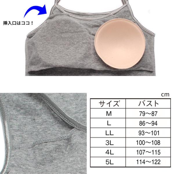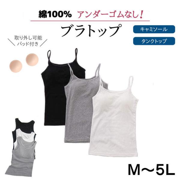 綿100%ブラトップ キャミソール カップ付インナー 締め付けない 背中&アンダーゴムなし 敏感肌 取り外し可能パッド付 ブラキャミ (M〜LL)