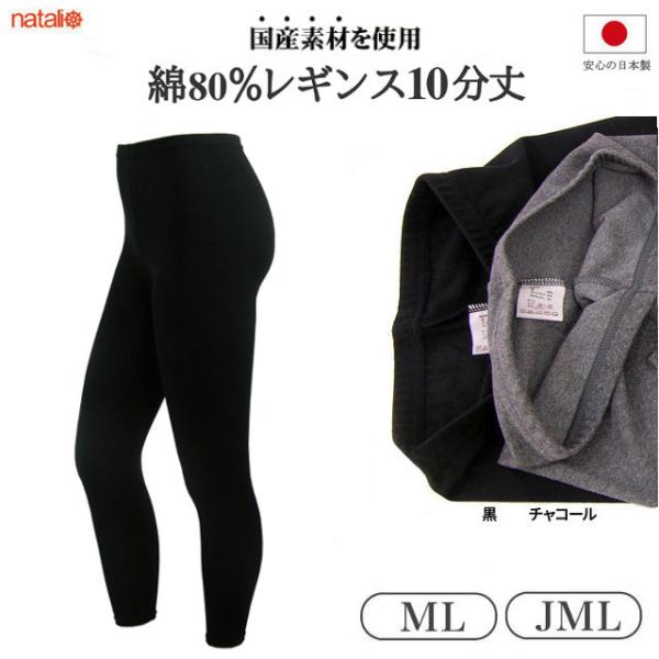 日本製 黒 チャコール 10分丈 綿75% レディース 柔らかストレッチ インナーボトム レギンス (ML/JML)
