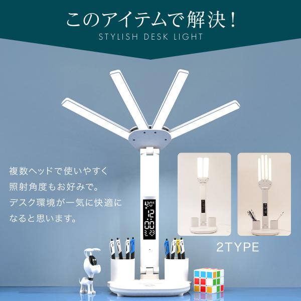 ヘッドが2本または4本あり、影ができにくく、デスク全体を均一に照らします。