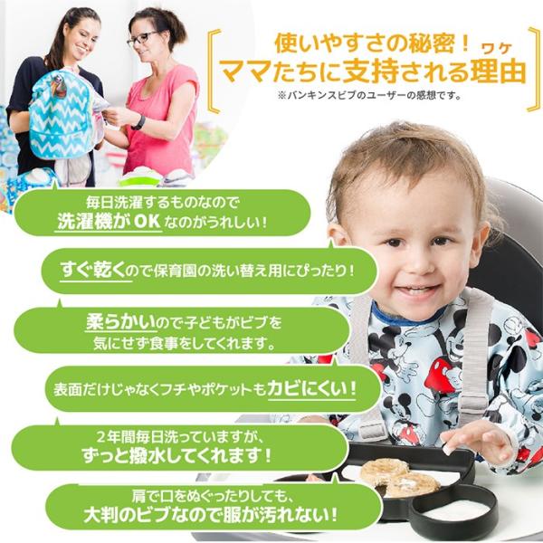 バンキンスのビブやスモックは、洗濯機で洗えてすぐ乾くポリエステル100%の素材でお手入れも簡単。