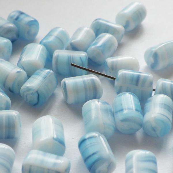 格安 ミリアムハスケルヴィンテージビーズ ブルーXホワイトマットプレスビーズ レアな円筒型 7x5mm 30個 1セットを送料無料でクリックポストでお送りします。