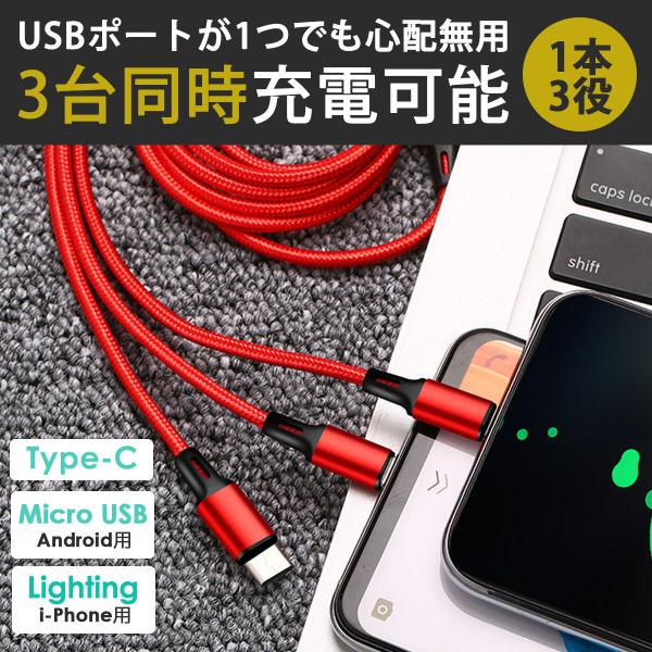 iPhone 充電ケーブル 3in1 タイプc type-c Android マイクロ Micro USB 充電器 ケーブル 1m