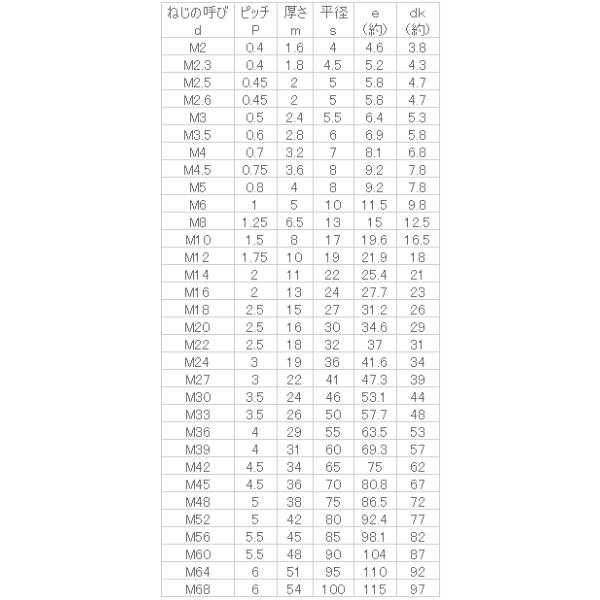 ■説明:ナットの標準品と言ったらこちらの六角ナット(1種)となります。片側のみの面取りとなっています。小ねじやボルト等のねじと併せて幅広く使用されています。■規格:JIS B1181附属書に基づいています。■材質:ステンレス(SUS304など)■寸法の呼び方:(ねじの呼びd)