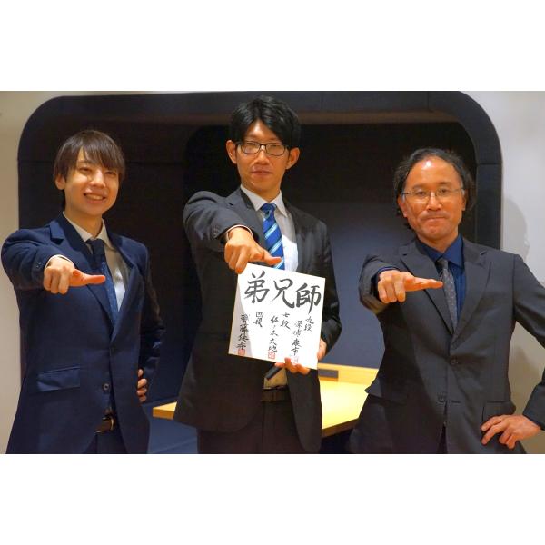 深浦一門 深浦康市九段、佐々木大地七段、齊藤優希四段、3人直筆連署扇子!◇種類師兄弟◇サイズ8.5寸、化粧箱入り※直筆のため、写真とバランス等異なる場合がございます。