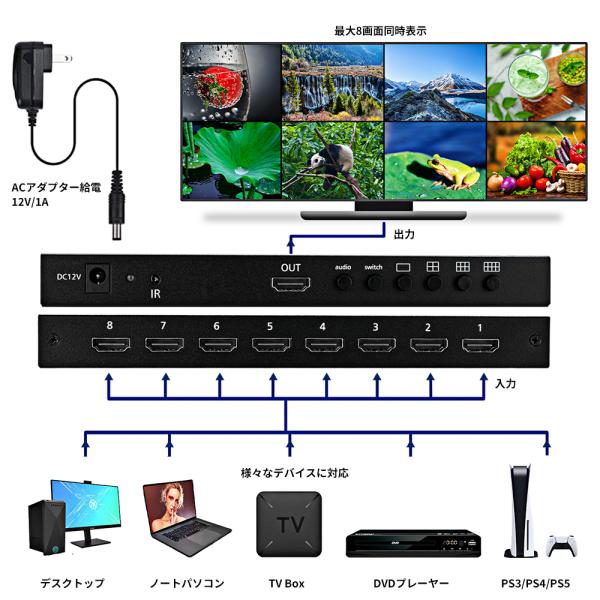 HDMI画面分割切替器 8入力1出力 4K2K 超高解像度 1モニターで8画面分割 全画面/4分割/6分割/8分割など6出力モード リモコン遠距離/本体操作 日本語取説付き 爆買