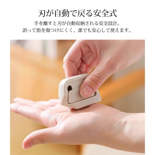 刃はスライド式で自動リターン設計、手が切れない安心構造だから子供や女性でも安全に使えます。
