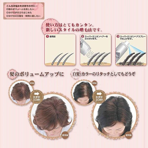●スーパーミリオンヘアミストをスプレーす…<br><br>[-][グレーNo.11][ダークブラウンNo.2][ブラックNo.1][ホワイトNo.15][ミディアムブラウンNo.23][ライトブラウンNo.3][美容雑貨総合][ブランド別][スーパーミリオンヘアー][JAN: 4969972323288]