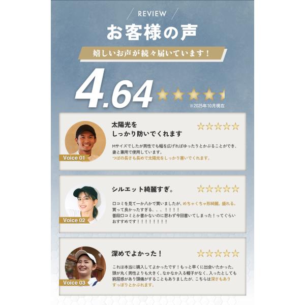 【選べる2サイズ展開】Mサイズ(55〜58cm)とLサイズ(59〜62cm)の2サイズ展開。深め設計で快適なフィット感を提供し、長時間の着用もストレスフリー。「キャップが似合わない」と感じていた方にもおすすめの一品です。