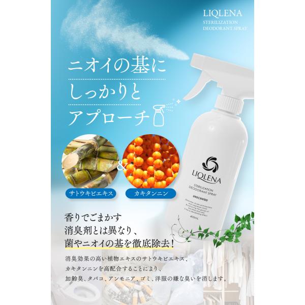 無色・無臭の除菌・消臭スプレー ニオイの基から除去しますので香りでごまかさない 衣類・寝室・トイレ・ペット用品・タバコ臭・台所周り・車内と匂いが気になる全てのシーンで活躍します。