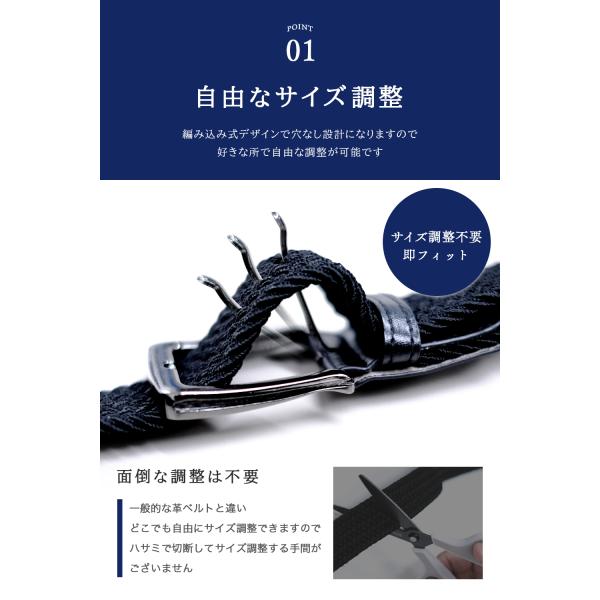 編み込み式デザインで穴なし設計になりますので好きな所で自由な調整が可能です。