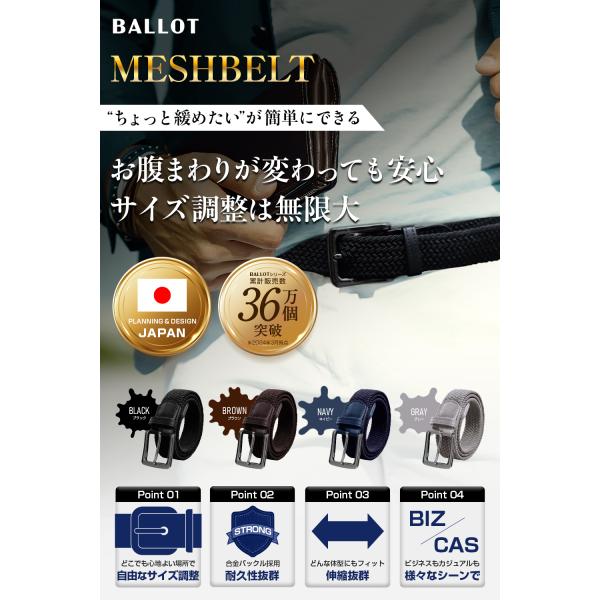 ベルト メンズ メッシュベルト 穴なし 無段階 編み込み カジュアル 伸縮ベルト BALLOT バロット