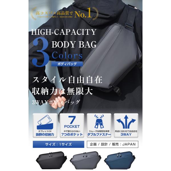 【充分な収納力】ボディバッグをお探しの多くの方からの声で「長財布や折り畳み傘、タブレットを入れたいけど、あともう少しが入らない…」「自分自身大柄なので、もう一回り大きいサイズが欲しい」等のお声が散見されましたので、ご意見を参考に大幅改良。500mlペットボトル・折り畳み傘・タブレット(最大9.7インチ)を楽々収納できるサイズ感で、大柄な方でもカバンが浮くことなくスタイリッシュに使用可能です。