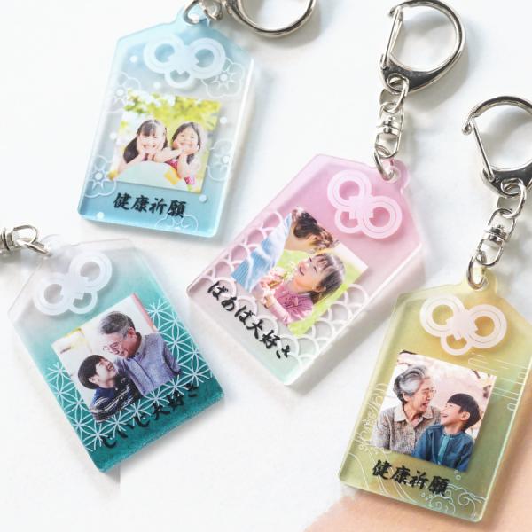 お守り 写真 キーホルダー 子供 ペット 写真入れ 敬老の日 出産祝い 名入れ ストラップ こども 孫 名前 アクリル 小さい お守り型 写真入り 名前入り