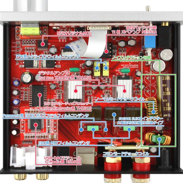 YAMAHA製YDA-138デジタルアンプIC2基をモノラル駆動させ、左右チャンネル独立型デュアルモノラルアンプ構成にすることによりチャンネルセパレーションを大幅に改善しています。チャンネルセパレーションの改善により、定位が大幅に向上しています。