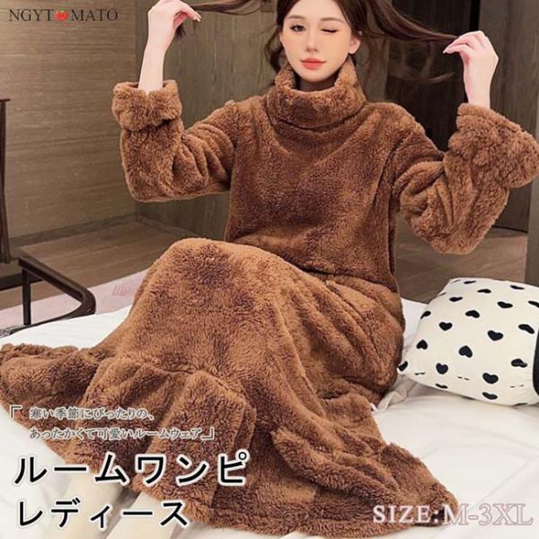 ルームワンピース ロング丈 ルームウェア 長袖 パジャマ レディース 部屋着 寝間着 ハイネック ナイトウェア 保温 もこふわ 暖かい カジュアル 秋冬 可愛い